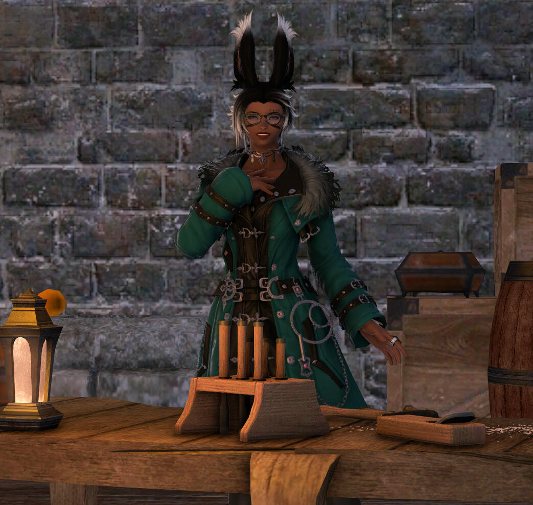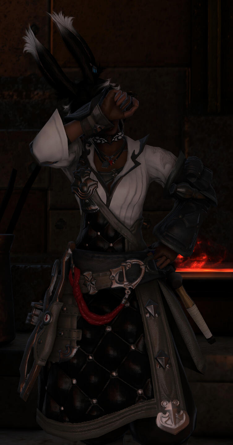 Nevra decided she had seen enough suffering and gave Hydaelyn the finger! (granted she threw up the wrong finger, but hey, she had spirit). One afternoon, little Nevra's father was greeted by a strange man at their door. He was holding a worn sack, the weight of its contents sinking at the bottom as he held it up to the father. Apparently Nevra had spent every coin she had earned on materials from a local vendor and even had it delivered directly to her own home! The costs were of course greatly discounted for the small Viera to afford as no one could say no to her adorable pleading eyes and her droopy ears. That very night, at the age of fourteen, she began her official training underneath her father's teachings to become a blacksmith and to craft her first hammer from the materials she had bought. This would be the start of her journey on mending the worlds wounds.